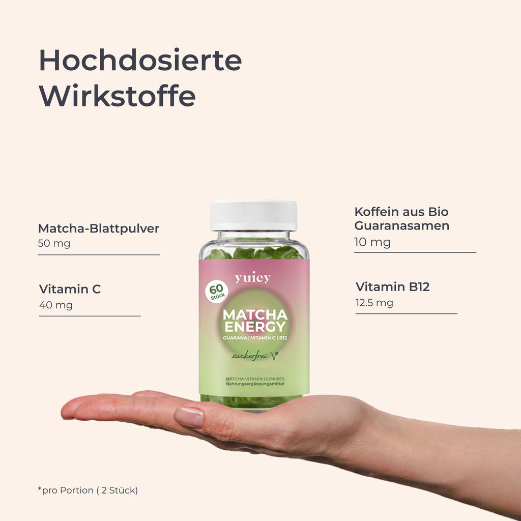 Vitamin C trägt zum Schutz der Zellen vor oxidativem Stress bei und unterstützt das Immunsystem. Vitamin B12 fördert die normale Funktion des Nervensystems und hilft bei der Verringerung von Müdigkeit. Gemeinsam sorgen sie für Energie, Fokus und Vitalität.